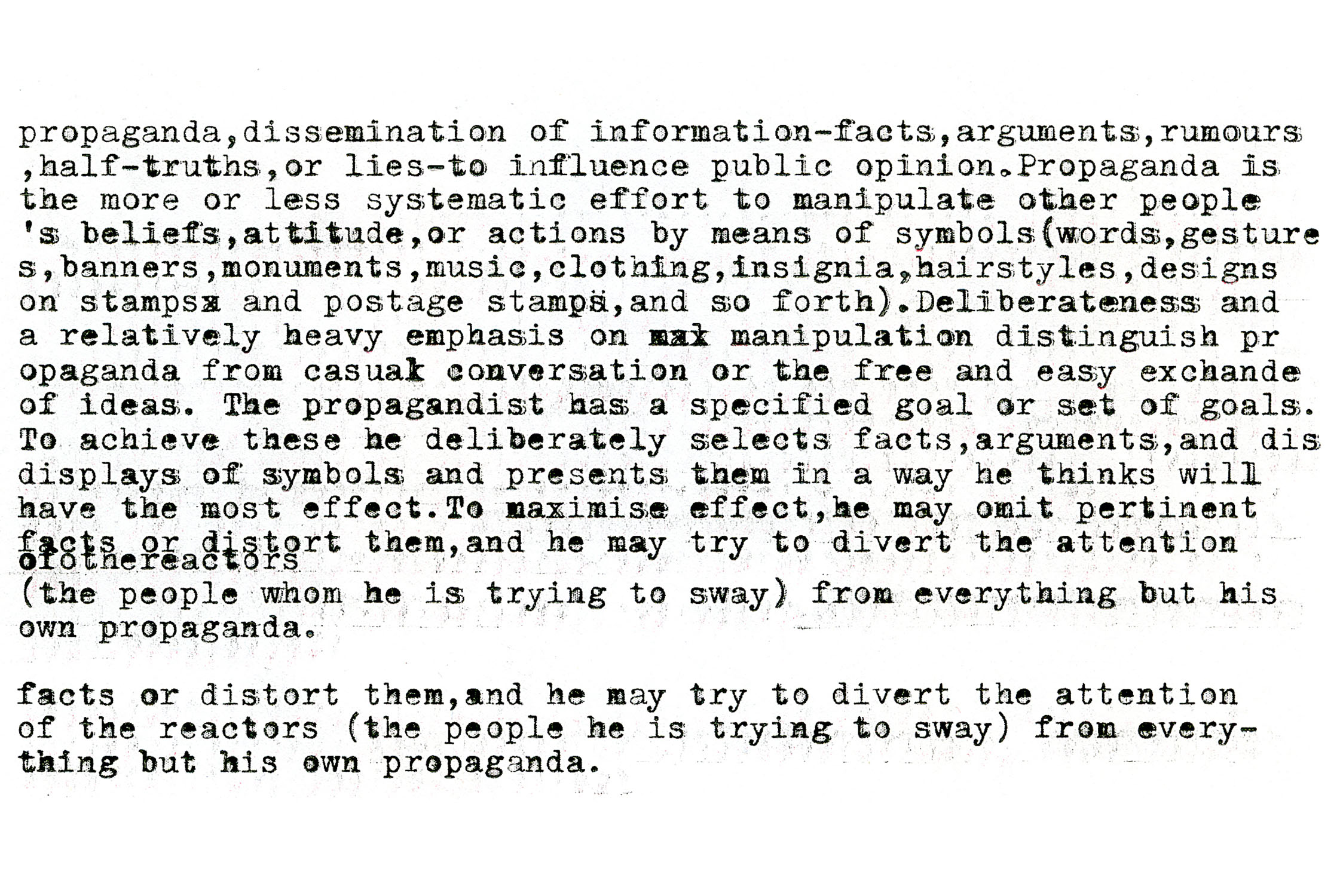 “Propaganda, dissemination of information-facts, arguments, rumours, half-truths, or lies-to influence public opinion. Propaganda is the more or less systematic effort to manipulate other people’s beliefs, attitude, or actions by means of symbols (words, gestures, banners, monuments, and postage stamps, and so forth). Deliberateness and a relatively heavy emphasis on manipulation distinguish propaganda from casual conversation or the free and easy exchange of ideas. The propagandist has a specified goal or set of goals. To achieve these he deliberately selects facts, arguments, and displays of symbols and presents them in a way he thinks will have the most effect. To maximise effect, he may omit pertinent facts or distort them, and he may try to divert the attention of the other actors (the people whom he is trying to sway) from everything but his own propaganda.” - Encycloepedia Britannica.