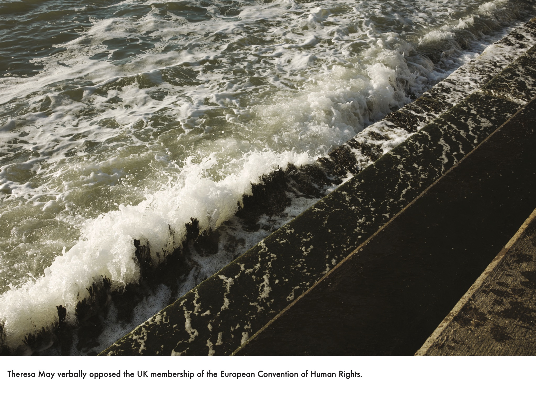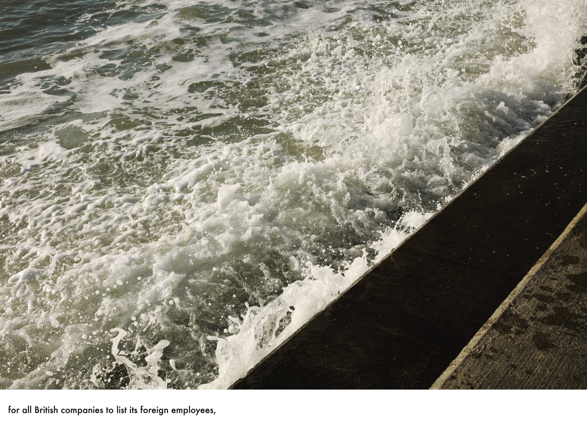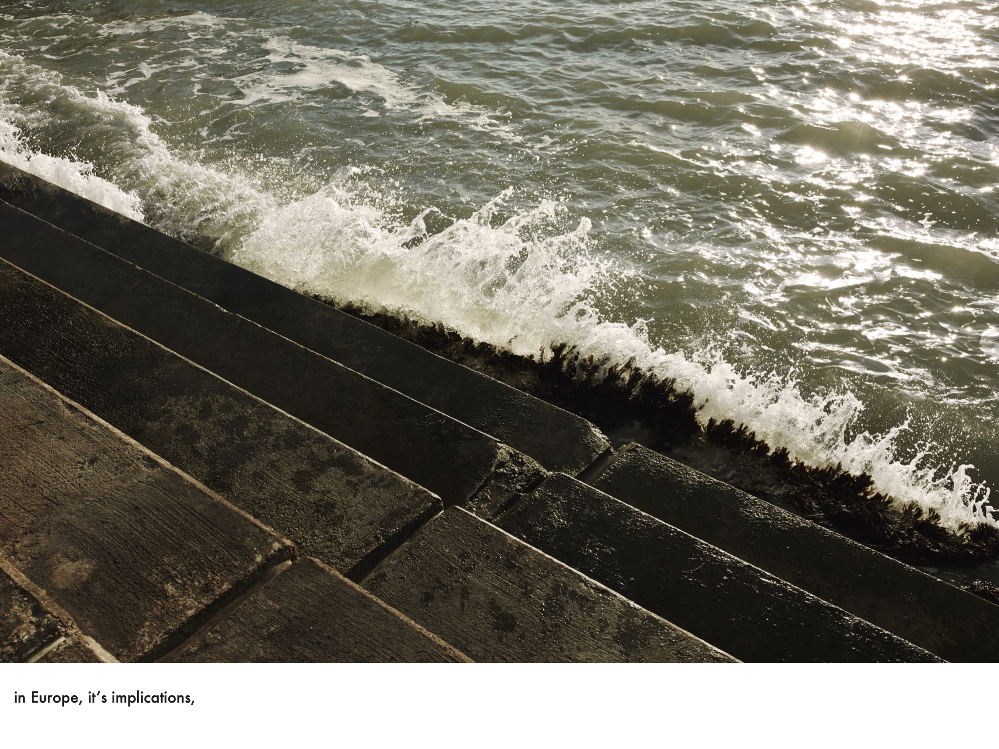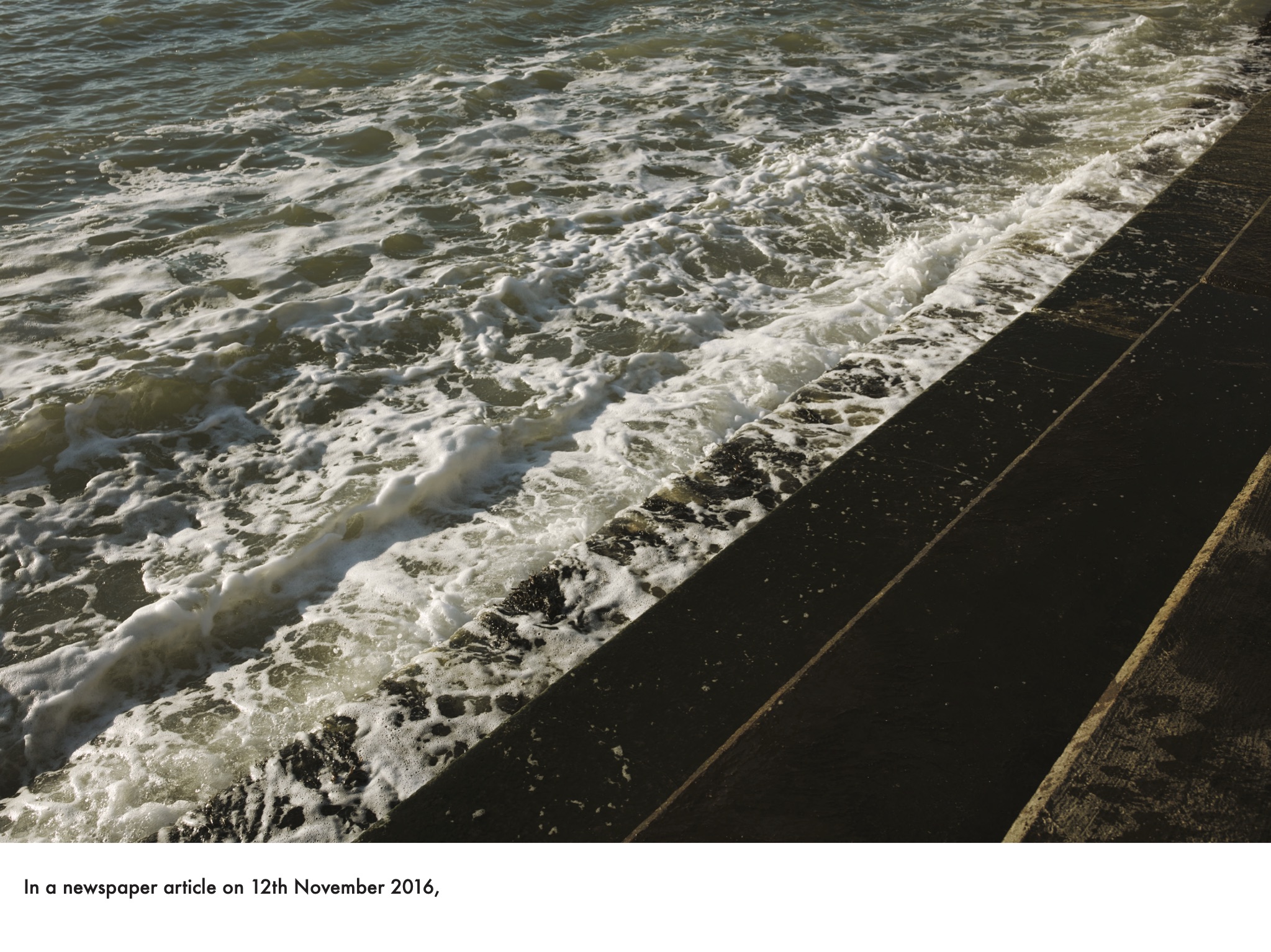 In December 2018, I stood on the steps to the channel at Dover and photographed the sea. Showing waves crashing into concrete, these images express the emotional turmoil I experienced during Brexit. In Finstere Zeiten [Dark Times], I have combined these shots with text drawn from newspapers, books, and personal experience, which illustrate the intensity of the division and debate in Britain at this time. I am interested in documenting moral shifts in society, changes which are initially almost imperceptible then slowly lead a society into a different direction; over the last decade, Britain has undergone a profound change. The title of my project comes from Hannah Arendt’s book, Men in Dark Times, which argues that “of all the specific liberties which may come into our minds when we hear the word freedom, freedom of movement is historically the oldest and also the most elementary”. The images focus on the sea, an ever-moving body that flows from place to place. The channel isn’t owned by a single country and, while it serves as a frontier, it’s also always facilitated travel.
